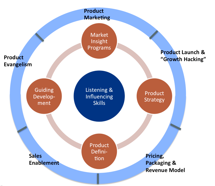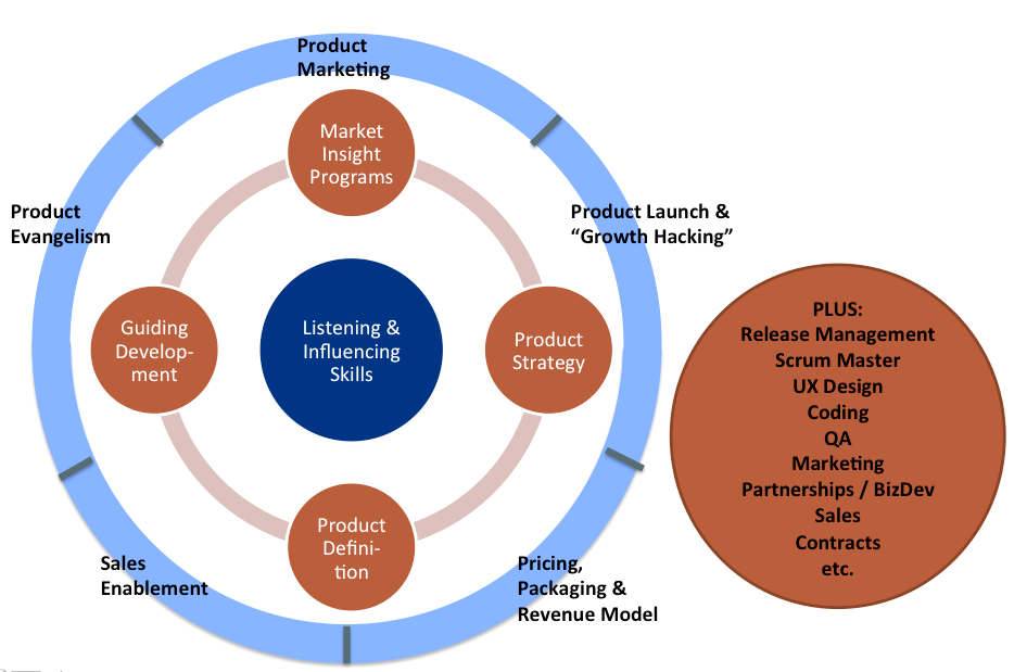 So, at every FUNCTIONAL product management organization I've seen, this diagram shows the CORE activities of Product Management that can't safely be assumed by another function in the company: